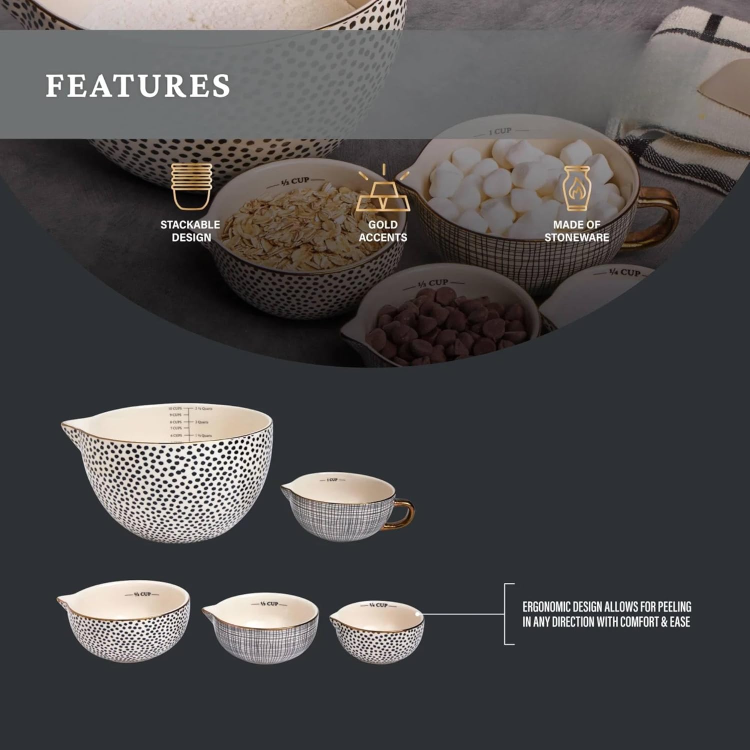 | Other Special Features of the Product | Built-in measurement markings; multi-piece set; decorative pattern; stackable design |