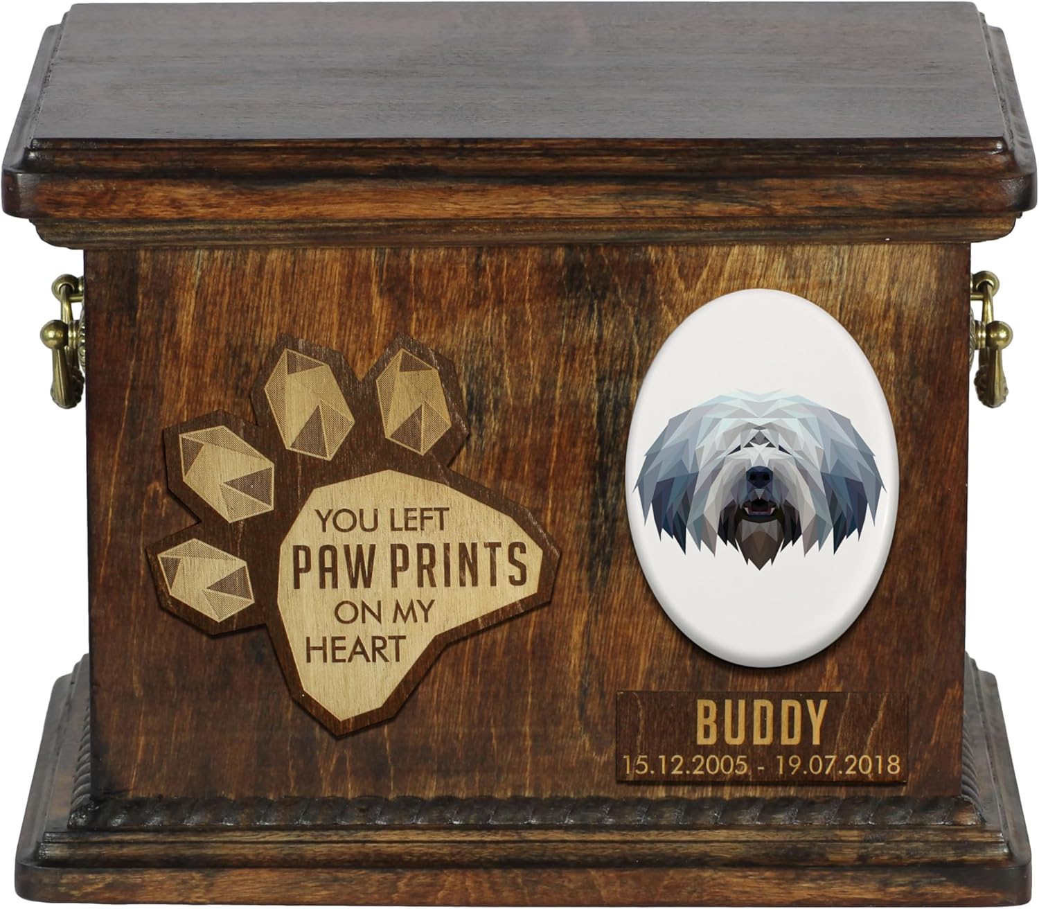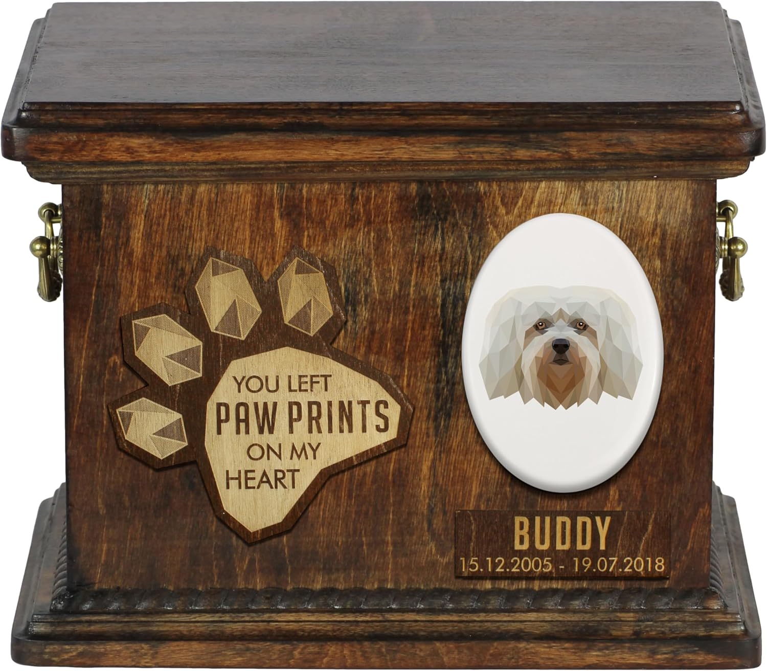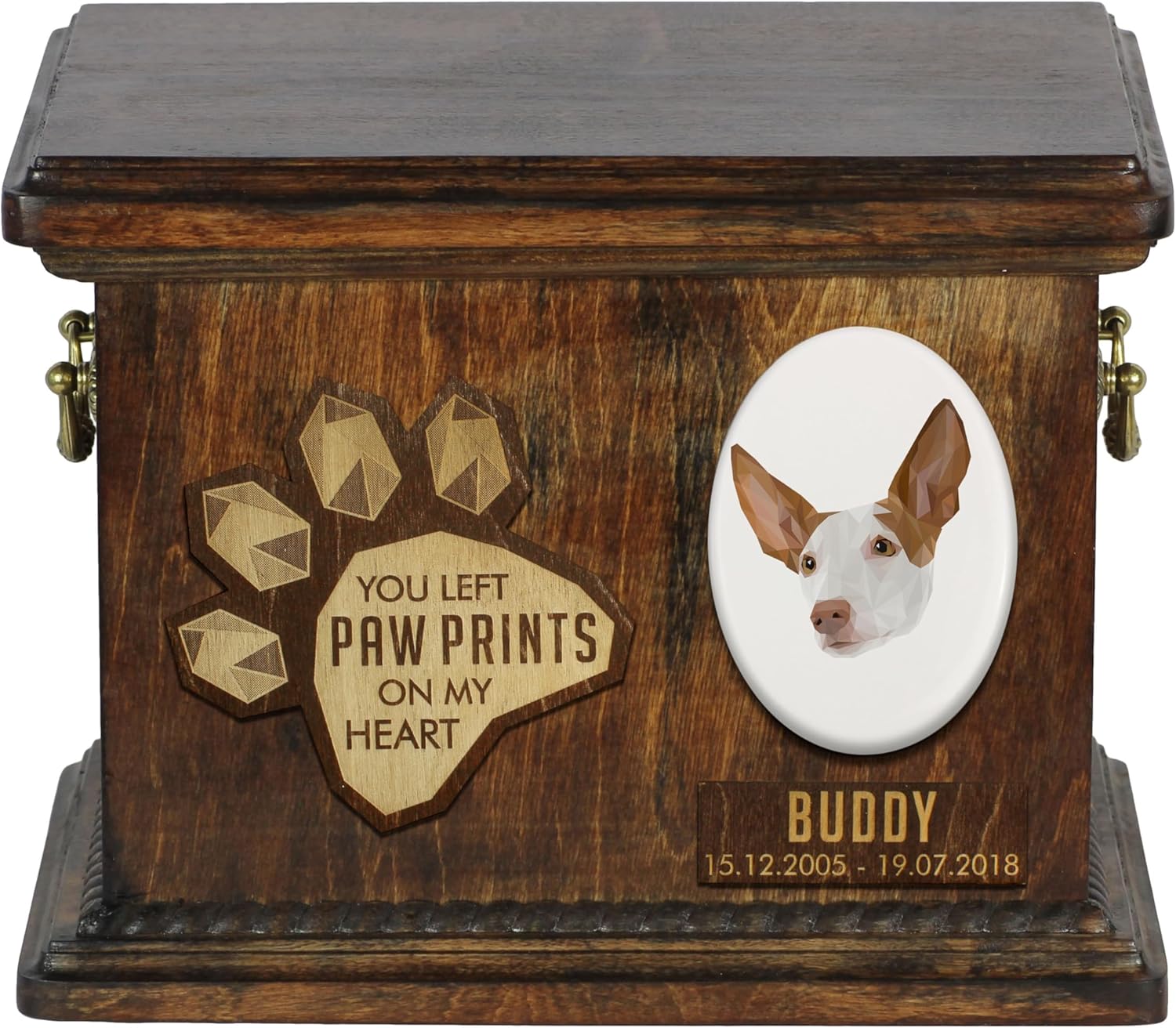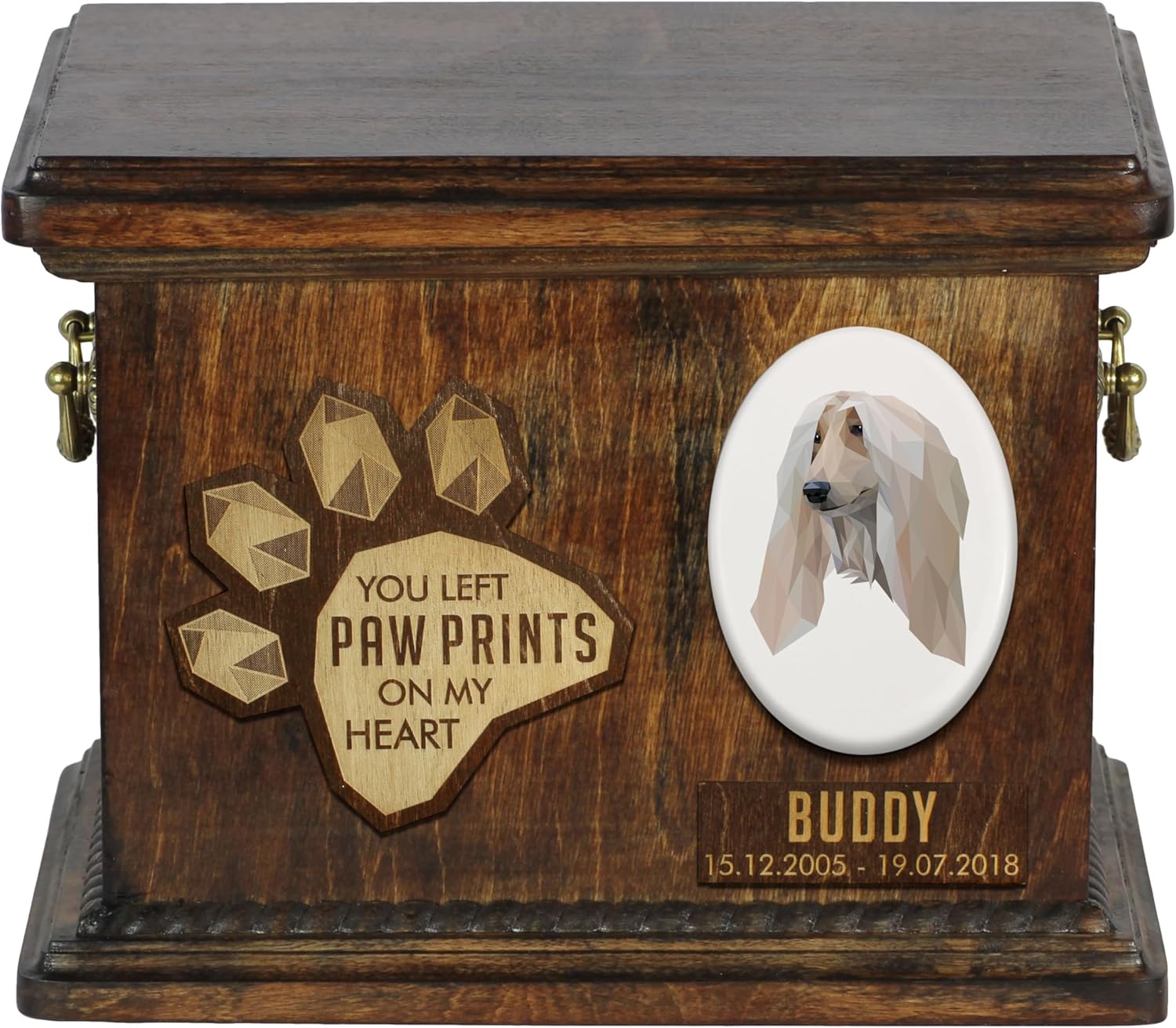 Celebrate the life of your cherished canine companion with our Custom Geometric Dog Memorial Urn, a work of art from our Art-Dog Urns Collection. Handmade with precision, this urn goes beyond a simple cremation box; it is a personalized and elegant tribute to the bond you shared with your beloved dog. The geometric elegance of this urn sets it apart. The dog’s portrait, intricately combined with geometric patterns, creates a unique and visually stunning memorial. This urn offers a variety of geometric breeds to choose from, allowing for a personalized memorial that resonates with your dog's individuality. Brass handles and wreath-shaped decorations add a touch of sophistication, making it a true work of art.