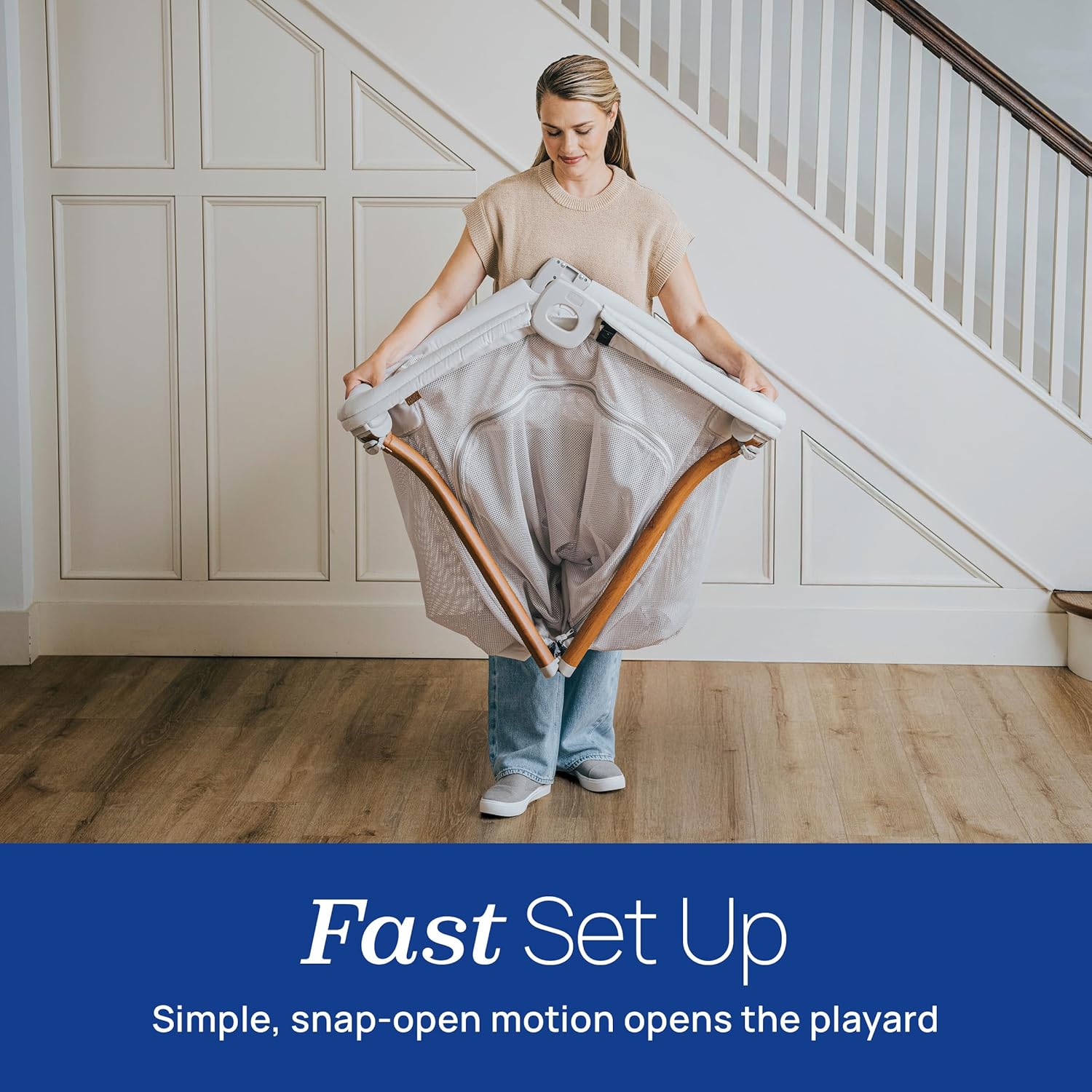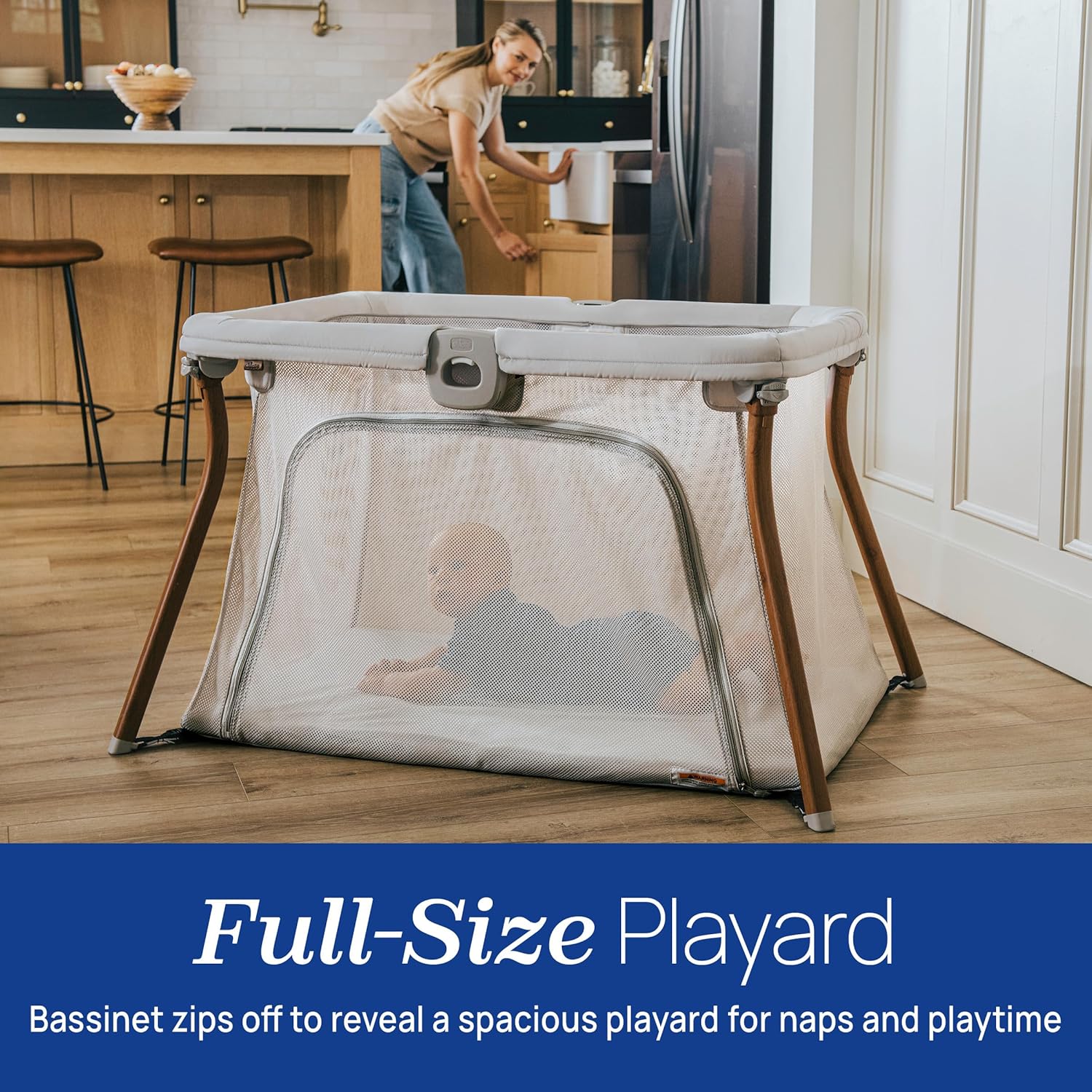 The Chicco Alfa Lite Nest Lightweight Travel Playard with Zip-on Bassinet is a fuss-free baby playard for sleep and play. With a single-motion snap-open setup, the easy setup baby playard is ready in seconds – no tools, no assembly. The full-size baby bassinet easily zips on or off (can stay attached when folded) and accommodates infants up to 15 lbs, while the roomy playard area supports little ones up to 30 lbs or 35” tall. The zip-open side panel allows gentle access to soothe baby or let your little one crawl freely. When it’s time to clean, the waterproof mattress surface wipes down easily and the frame fabrics unzip for machine washing. A soft, fitted sheet is included. At just 15 pounds, the compact fold and included zippered carry bag make this a great travel crib for infants and portable playard for babies and toddlers. The warm oak wood-grain finish legs and creamy ivory fabric add a touch of modern style. GREENGUARD Gold Certified, Alfa Lite Nest has been tested for low chemical emissions, contributing to healthier air quality around baby. Effortless and practical – it’s perfect for growing families looking for a baby bassinet and playard combo.