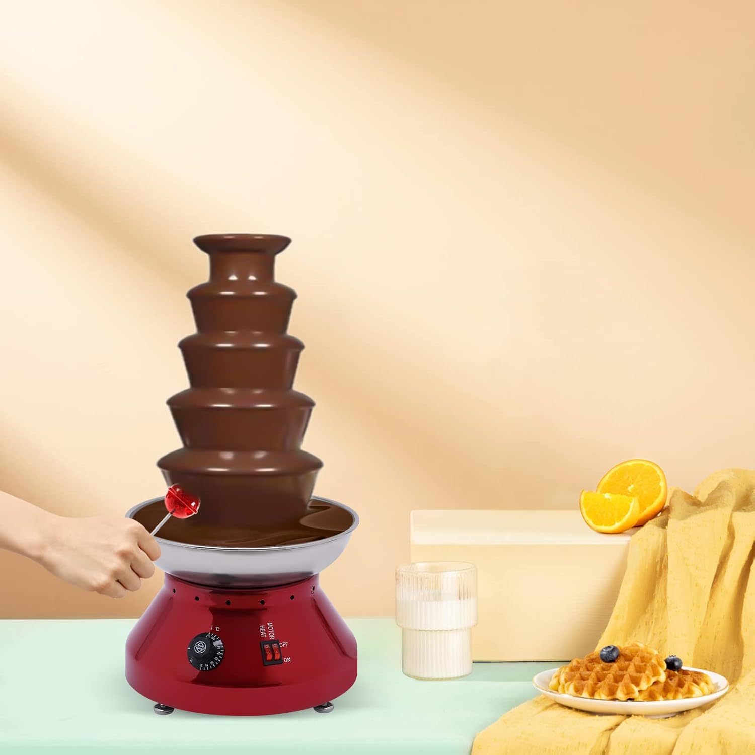 SpecificationMaterial: Food-grade Stainless Steel, Food-grade PP, PlasticModel: ET-CF-51 Color: Black/RedVoltage: 110V/60 HzTemperature Range: 30-110 ℃/ 86-230 °F Power: 230WCapability: 3000ml/ 7 lbCharging Line Length: 1.2m/ 3.9 ftPackage Size: 51*38*52cm/ 20.0*14.9*20.5 inchProduct Size: 33*33*61.3cm/ 13*13*24.1 inch Product Weight: 7.1kg/15.4 lbGross Weight: 7.7kg/ 16.9 lbPackage Included 1* Chocolate Fountain 1* Cleaning Brush1* English Instruction ManualNotes1. Please strictly follow the instructions for installation and use, and pay attention to the safety matters inside.2. Please allow the slight color difference caused by the shooting light and 1-3cm error due to manual measurement, and make sure you do not mind before ordering.