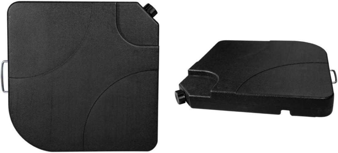 Universal umbrella water base that works for any umbrella that uses a conventional flanged cross brace base. Can be filled with water or sand so that plates provide additional weight required to improve umbrella stability in windy conditions.