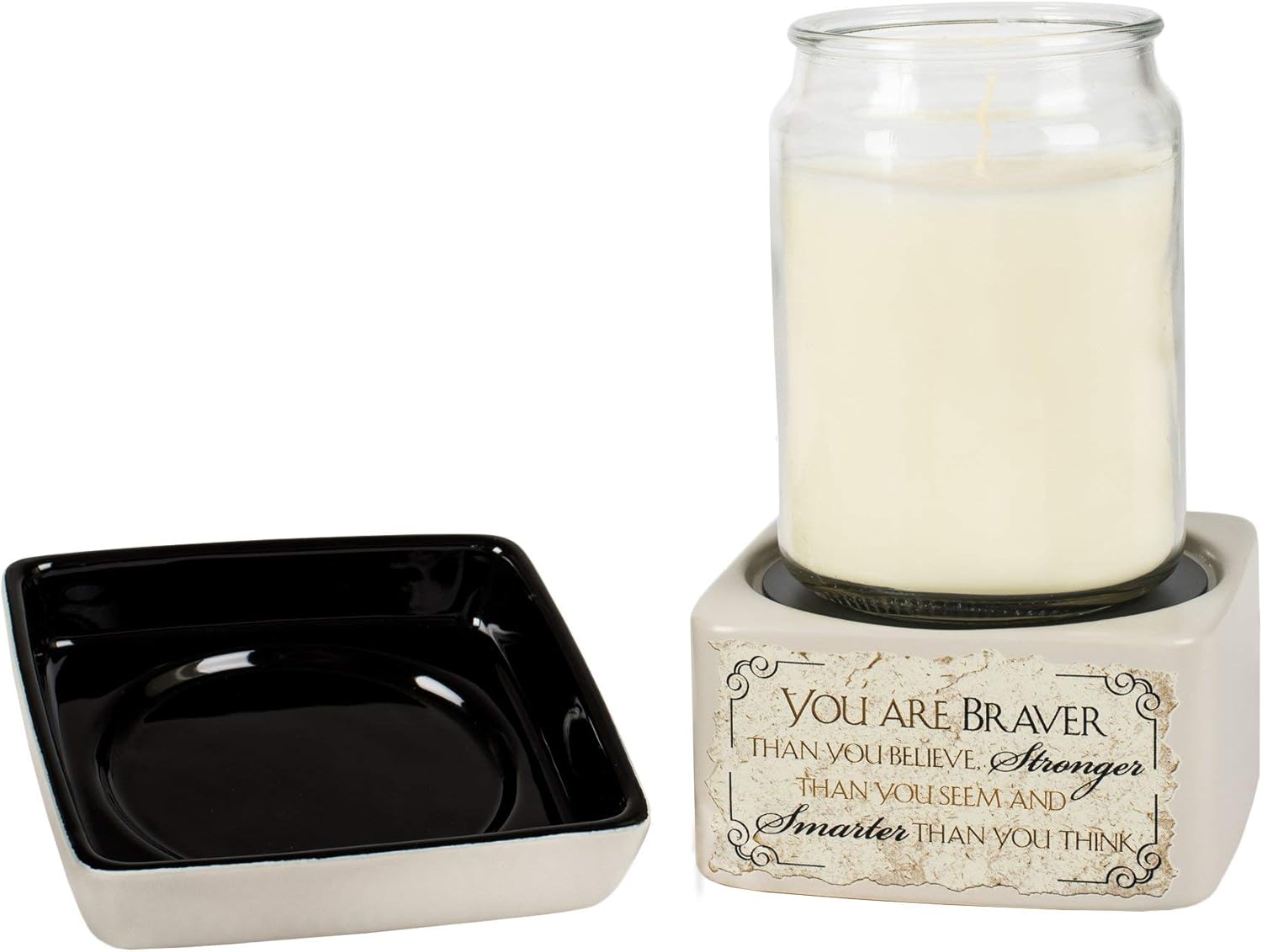 Sentiments read "God grant me the serenity to accept the things I cannot change, courage to change the things I can, and the wisdom to know the difference" and "You are braver than you believe, stronger than you seem and smarter than you think". Dual purpose allows top plate to be used to warm wax tarts, cubes, soy beads, potpourri, and scented essential oils; Remove top plate to warm a 12 ounce jar candle (use candle in container only) directly on metal warming plate. Fill your home with your favorite scents and aromas; Extend the life of your candles without burning the wick and eliminating soot, smoke, and mess. Made of thick, high quality ceramic stoneware; Measures approximately 5 x 5 x 3.75 inches; Easy spin, on/off switch with red indicator light; 110V electric plug on 3 foot cord. Adds meaning as a house warming gift and interest to your home decorating spaces; Boxed within fitted, protective packaging