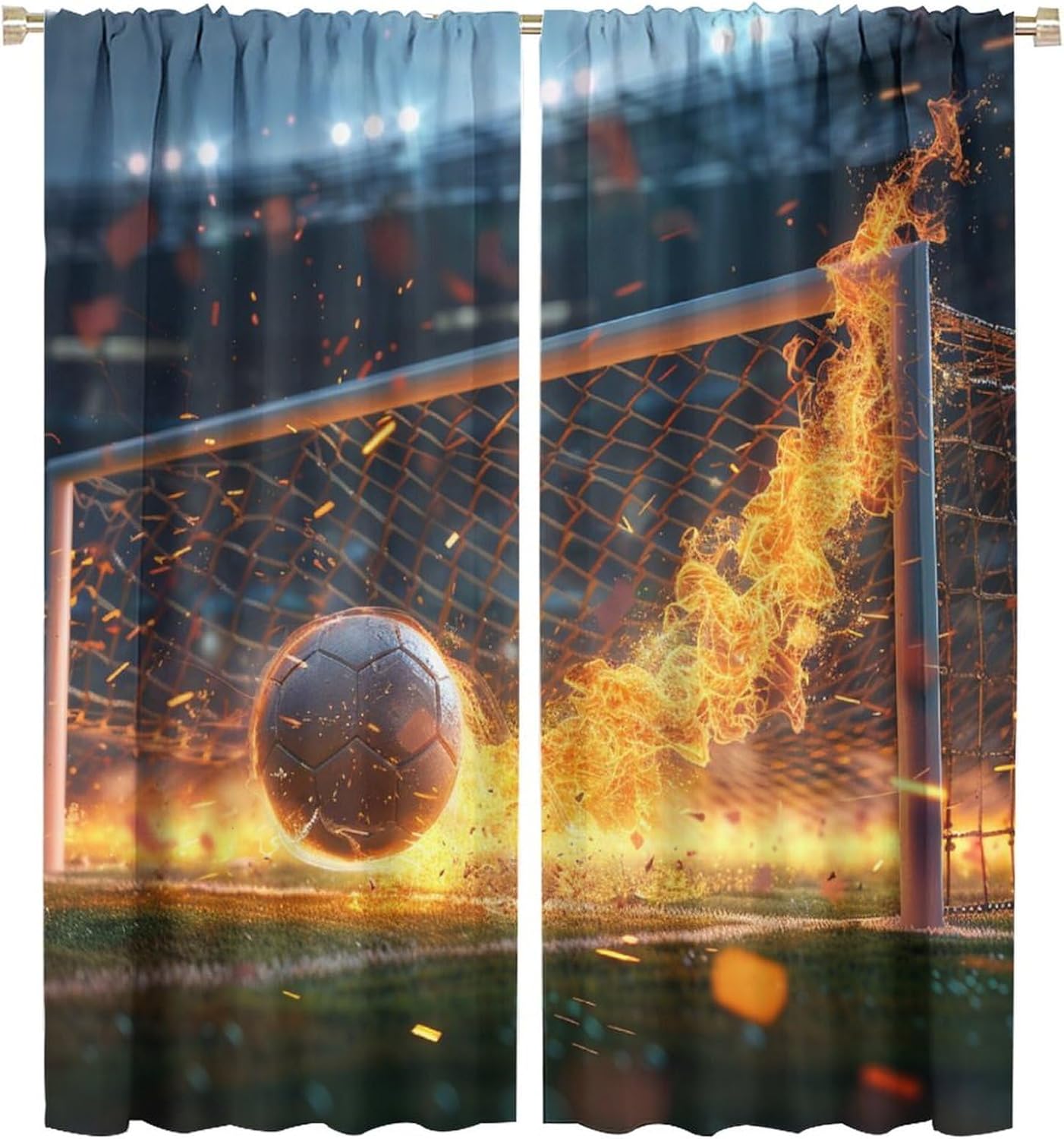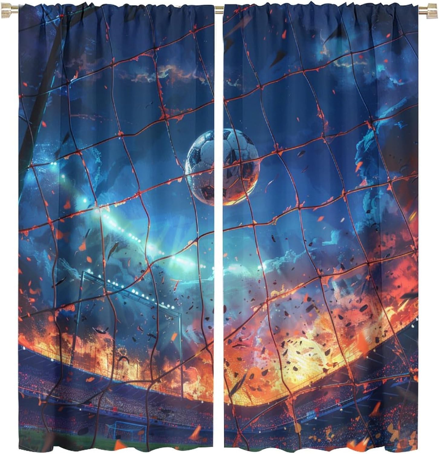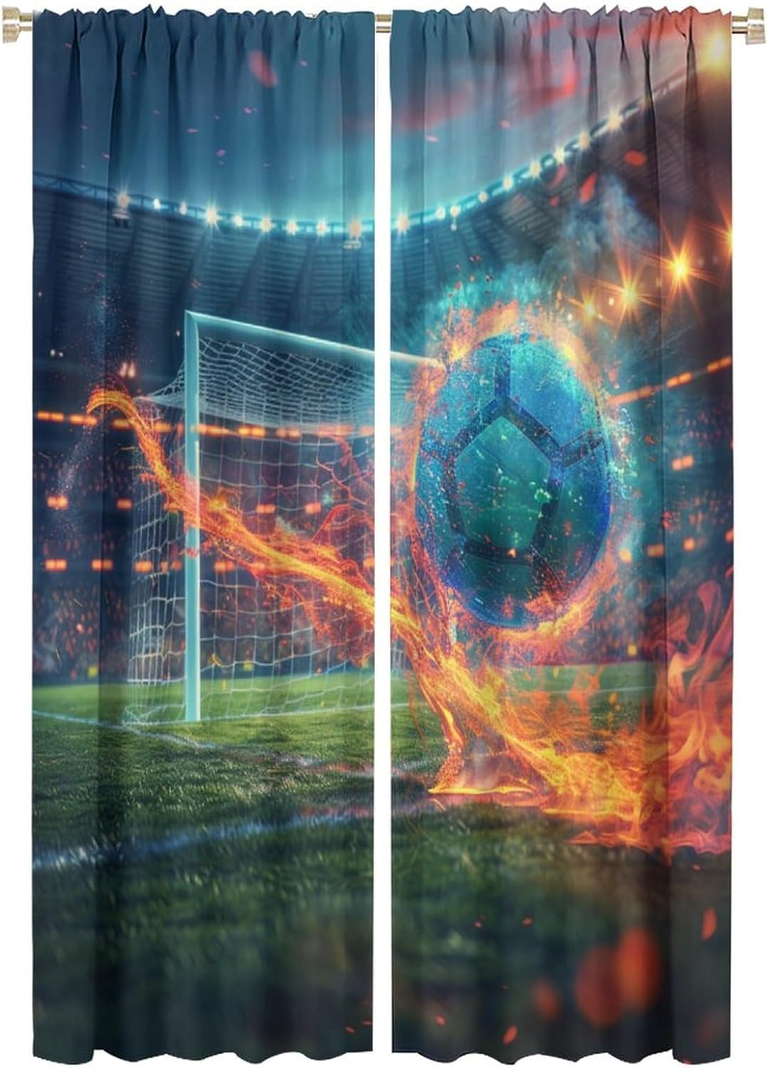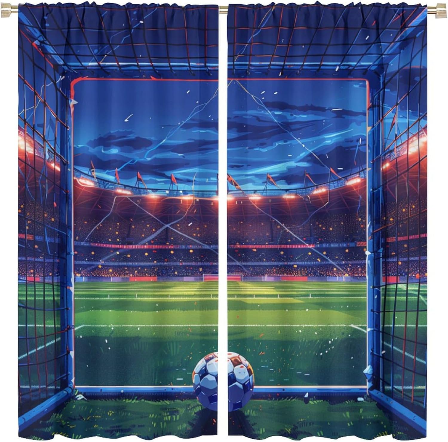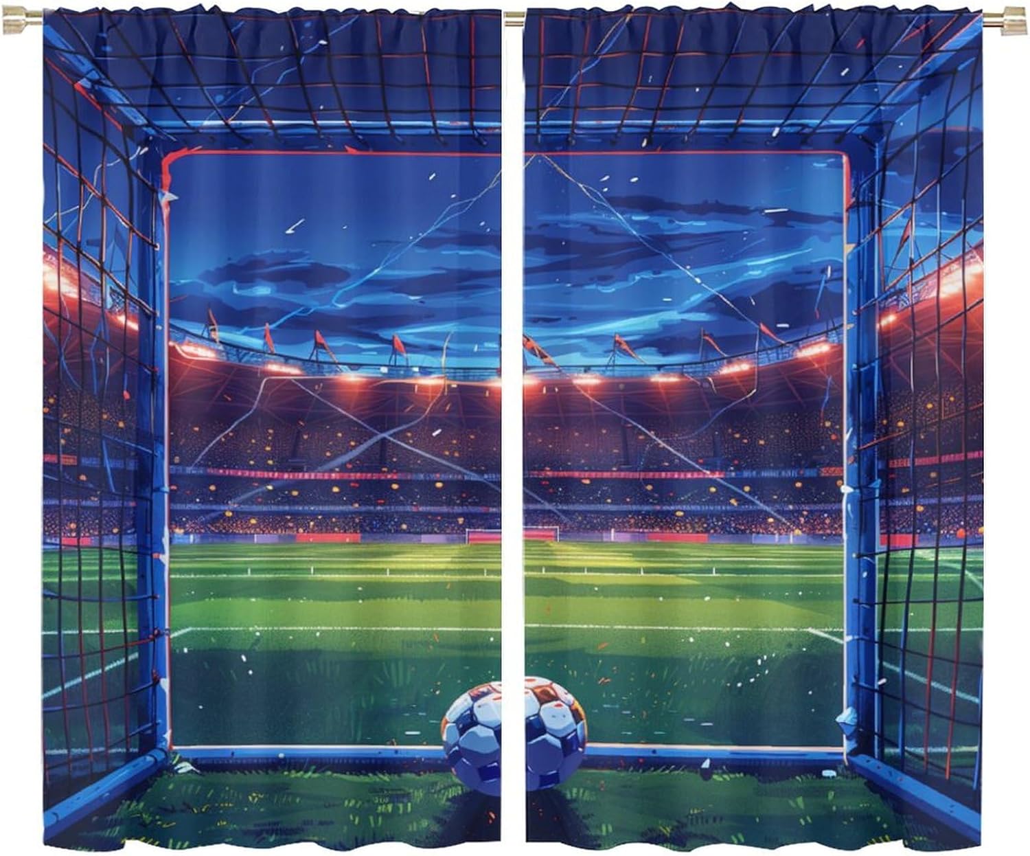 Welcome to our store.Flying Soccer Ball curtains is the beautiful choice for bedroom.The design is versatile and can blend with various home decor styles.Good and Healthy materialOur curtains are made of safe polyester fabric. Total size: 45" L × 42" W (114cm × 107cm),Includes two pieces, each of which measures:45" length × 21" width (114cm × 53.5cm).Total size: 54" L × 42" W (137cm × 107cm),Includes two pieces, each of which measures:54" length × 21" width (68.5cm × 53.5cm).Total size: 63" L × 42" W (160cm × 107cm),Includes two pieces, each of which measures:63" length × 21" width (160cm × 53.5cm).Total size: 63" L × 55" W (160cm × 140cm),Includes two pieces, each of which measures:63" length × 27.5" width (160cm × 70cm). Total size: 63" L × 63" W (160cm × 160cm),Includes two pieces, each of which measures:63" length × 31.5" width (160cm × 80cm). Total size: 72" L × 63" W (183cm × 160cm),Includes two pieces, each of which measures:72" length × 31.5" width (183cm × 80cm). Total size: 63" L × 72" W (160cm × 183cm),Includes two pieces, each of which measures:63" length × 36" width (160cm × 91.5cm).Total size: 84" L × 84" W (214cm × 214cm),Includes two pieces, each of which measures:84" length × 42" width (214cm × 107cm).Our curtains are perfect for Late sleepers, Shift workers, Seniors, Infants, Students, Computer operators and many more.Kindly Remind:- Don't use sharp things scratching curtains.- For proper fullness panels should measure 1.5-2 times the width of your window.- As different computers display colors differently, the color of the actual item may vary slightly from the above images.