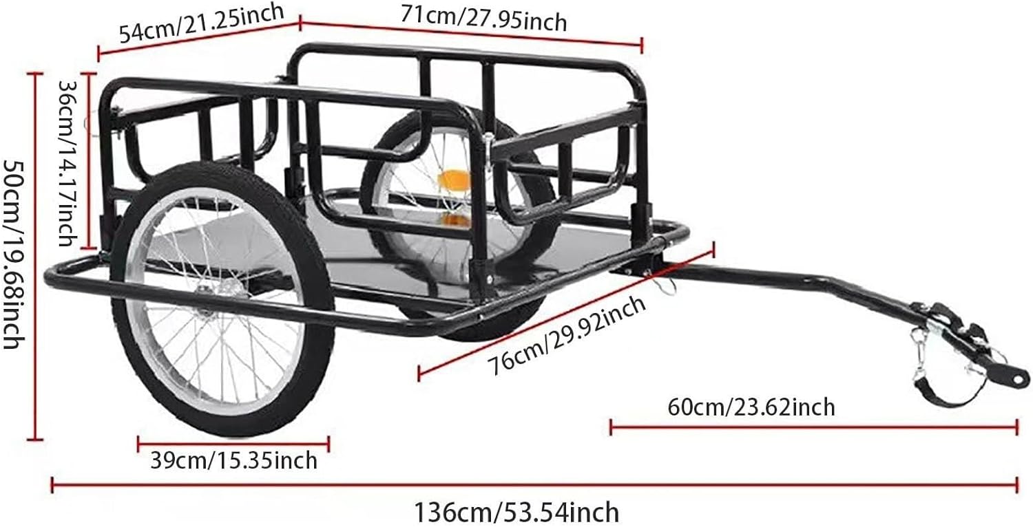 The Foldable Bicycle Cargo Trailer is the perfect solution for cyclists who need to haul heavy or bulky items. Designed to handle a maximum load of 60kg/132lbs, this versatile trailer is ideal for transporting groceries, camping gear, tools, and more.Equipped with 16-inch wheels and yellow reflectors, this trailer ensures a smooth, stable ride and increased visibility, especially during low-light conditions. The air-filled tires provide traction on various terrains, making it perfect for both urban commuting and outdoor adventures.Constructed with steel, the trailer is built to last and withstand the elements, ensuring long-term reliability. The foldable design allows for easy storage when not in use, making it an ideal space-saver for homes or garages with limited room.The bike hitch offers quick and secure attachment to a wide range of bicycles, including mountain, road, and hybrid bikes, providing flexibility and ease of use. Whether you're hauling groceries, moving items, or setting up for a camping trip, this bike cargo trailer is an essential tool for your outdoor activities.SPECIFICATIONS:Material: SteelTrailer Size: 136x50x76cm (53.54x19.68x29.92 inches)Cargo Area Size: 71x54x36cm (27.95x21.25x14.17 inches)Weight Capacity: 60kg/132lbsWeight: 12kg/26.45lbsPACKAGE INCLUDES:1 x Bike Cargo Trailer (includes all components)