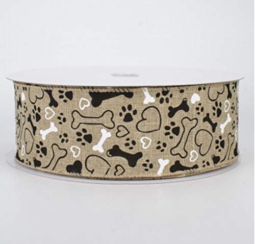 Adorable Natural Canvas Linen Wired 2.5" Ribbon with Dog Paw Prints, Dog Bones and Hearts This listing is for a HUGE ROLL of Natural Linen Ribbon with Dog Paw Prints, Dog Bones and Hearts. It is a 50 Yard Roll of Wire Edged Ribbon. PLEASE NOTE: Sometimes a seam occurs by the manufacturer and this cannot be controlled. This is not a defect. 100% Polyester - Made in Taiwan