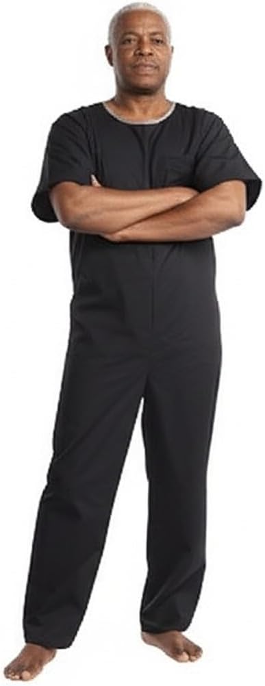 Great Special Needs Jumpsuit can help solve compulsive stripping problems with Alzheimer’s patients. Terrific in a nursing home or hospital setting. This jumpsuit is designed as a one-piece garment for the inappropriate undresser. Caregivers for those with dementia or Alzheimers appreciate these anti-strip jumpsuits. Won't allow undressing, self-toileting of diaper removal. It features a long back zipper from neckline thru waist. Round collar. Short sleeves. Also has two tab and snap closures at the back neckline, making it difficult for the wearer to open and remove. Elastic at sides of waistline gives the jumpsuit more of a fitted shape and body. It will discourage inappropriate undressing and is an ideal solution for those with a tendency to undress. Strong cotton twill fabric, is difficult to rip.