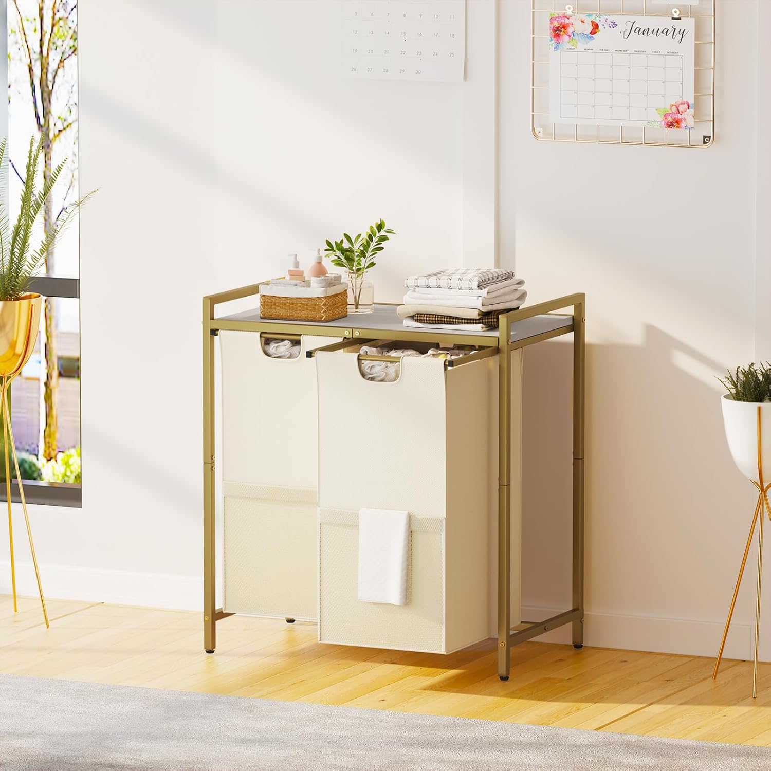 Huhote Laundry Hamper, double Laundry Basket, Laundry Sorter with Top Shelf & 2 Removable Washable Bags & Side Pockets for Laundry Room organization, Bathroom and Dorm, Gold and White