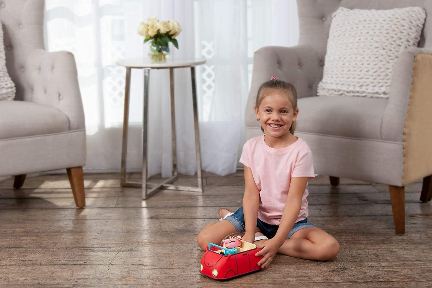 Peppa Pig and her family love to have fun together, so watch as they drive away for a fun-filled day in their Lights & Sounds Family Fun Car! Peppa’s car has all kinds of cool features. Press the trunk of the car and see it zip away with its headlights on. Watch it bobble to the beat of Peppa-inspired tunes. And the best part—it also plays iconic phrases from the show! This whimsical car includes Peppa and Daddy Pig figures, plus it fits two additional characters.