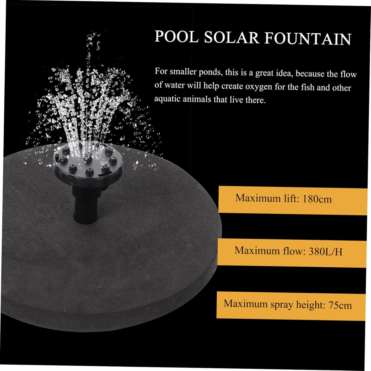 Package Include 1 x set of solar fountain kit Features - Size: 27.00X17.00X1.70cm/10.61X6.68X0.67in Solar Floating Fountain Pump Maximum spray height: 75cm Floating Fountain - Color: As Shown Solar Powered Sprinkler. Solar panel power: 5.5W Garden Pond Decoration Solar panel voltage: 10V Solar Fountain Pump Pump voltage: DC 10V solar pond fountain Maximum flow: 380L/H multi-purpose solar fountain Maximum lift: 180cm pond solar fountain Pump power: 2.5W Solar Fountain Pond or Garden Decoration - Material: ABS Fountain Pump. - The product has creative outlook and simple design, which is practical for people to use pool solar fountain. - The solar water pump set can be widely used in ponds, gardens, ponds, etc., and is very practical Floating Pump. - When you need to use them in a way for a long time, the product will quickly become your helper Water Pump. Specification Outdoor Water Pump - It is made with reasonable design and has lower operating noise, which is very practical Outdoor Fountain. - The solar fountain is creative and energy-saving, and can serve you well Garden Fountain Pump.Goods Descriptionmulti-purpose solar fountain This outdoor solar fountain kit is a wonderful landscape for your water pond, water garden, etc.Fountain Pump Powered by solar, safe and convenient to use.Solar Water Pump It can be used in the garden, yard, park, and everywhere to have a pond, decorative effect