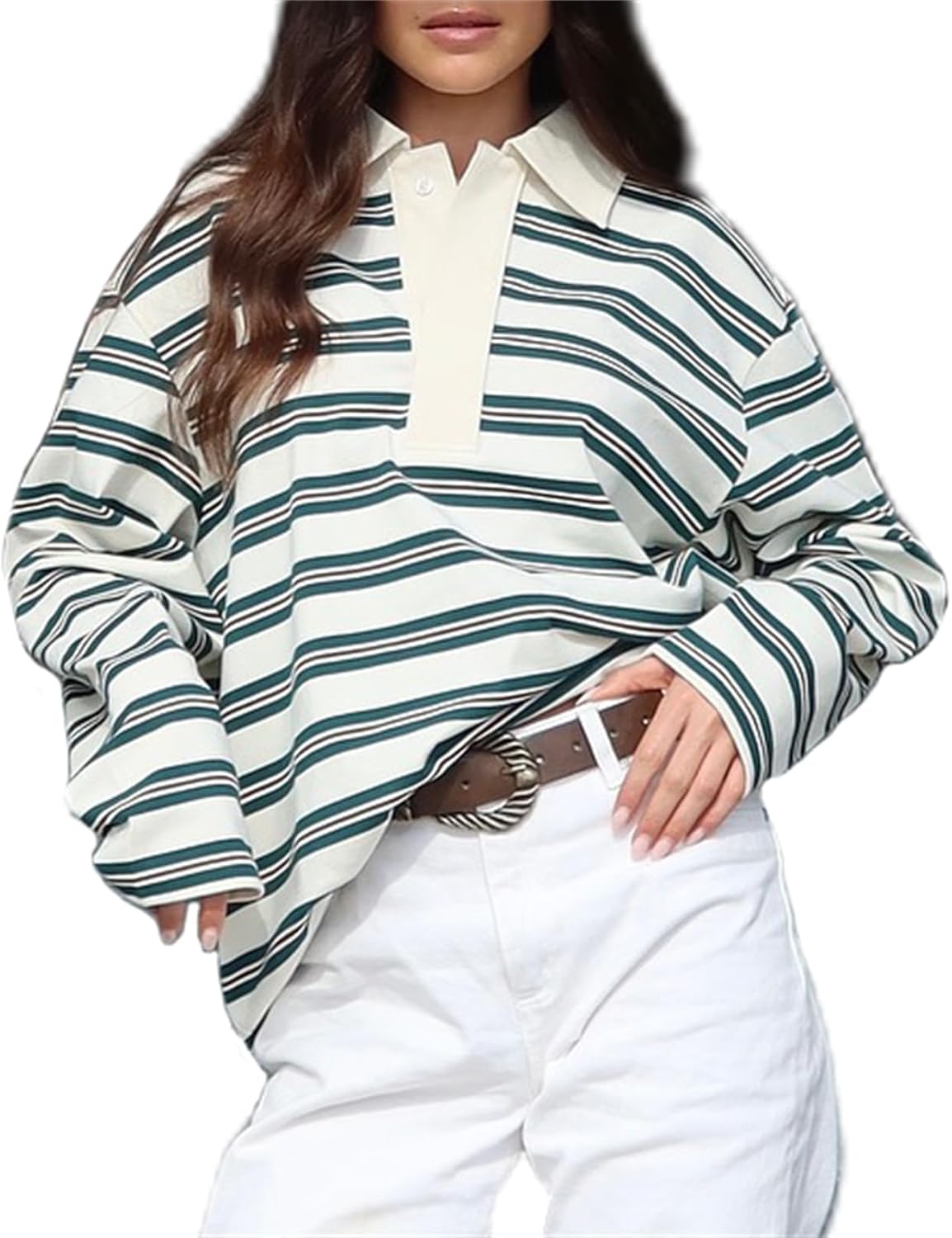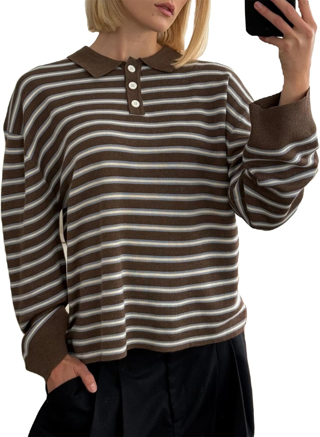 Elevate your wardrobe with our Women's Oversized Striped Knit Shirt A perfect fusion of Y2K nostalgia, 90s vintage charm, preppy style, and modern streetwear flair Designed with a lapel collared polo neckline, half button down placket, and bold striped pattern This long sleeve sweater is more than just a top, it's a statement piece that captures the essence of retro fashion while staying on trend Specification: Materials: 100% Polyester Pattern: Striped Size: S/M/L/XL Gender: Lady Package Contents: 1 x Tops Note: 1. Please understand there may be a 1-2 cm deviation exist. 2. Due to the lighting and monitors, there is a slight difference between the picture and the real item.